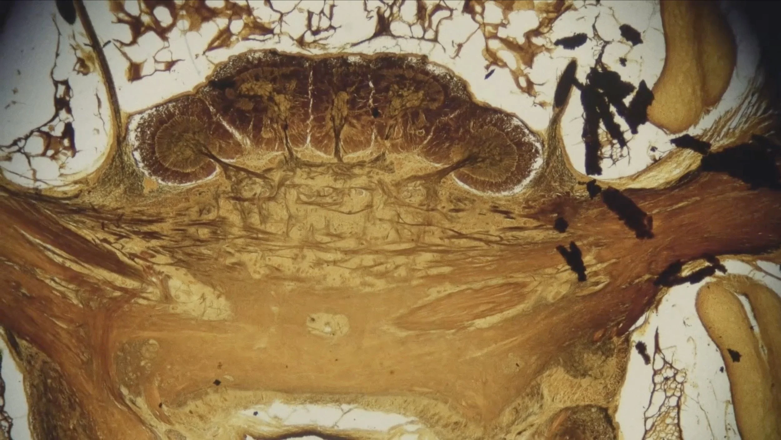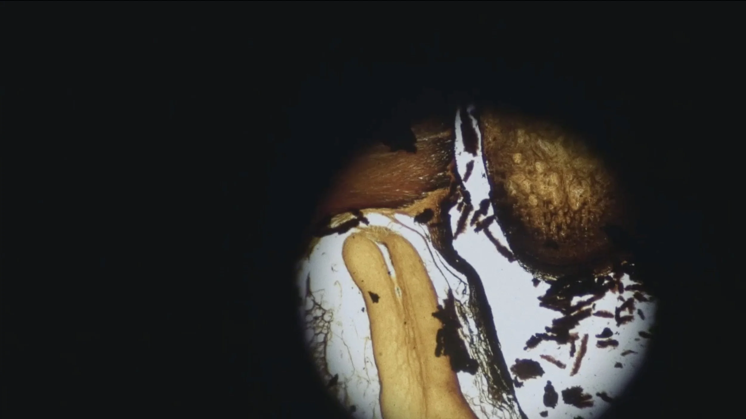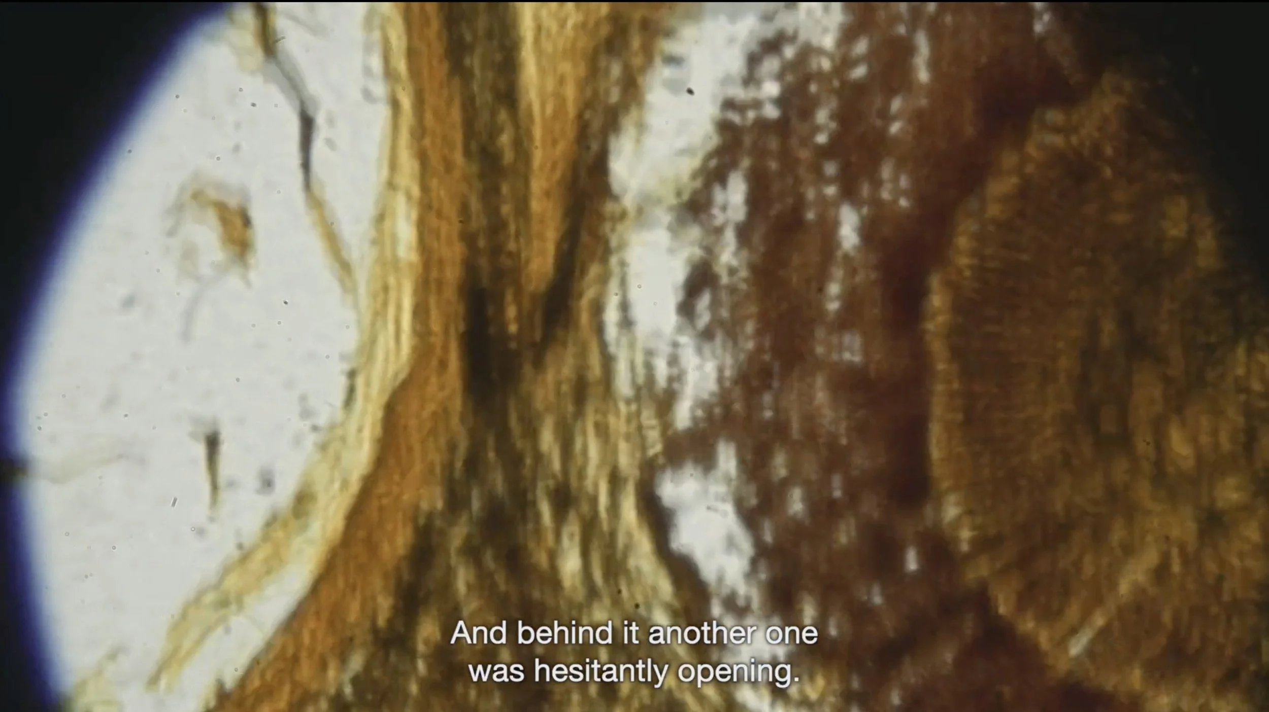 The biological research institute Stazione Zoologica Anton Dohrn in Naples was founded in 1872 by the German zoologist Anton Dohrn and is known for its research primarily in marine botany, biological oceanography, and evolutionary biology. The footage shows the optic nerves of an octopus filmed through a high-tech microscope belonging to the institute. The work examines the use of film and photography in biological science. At the same time, the connection between biology and photography is highlighted in the form of experiments with animal gelatine applied onto the film.