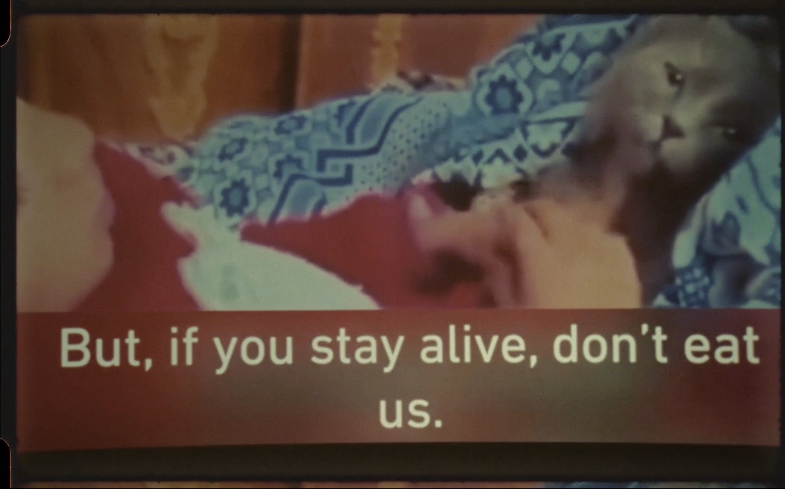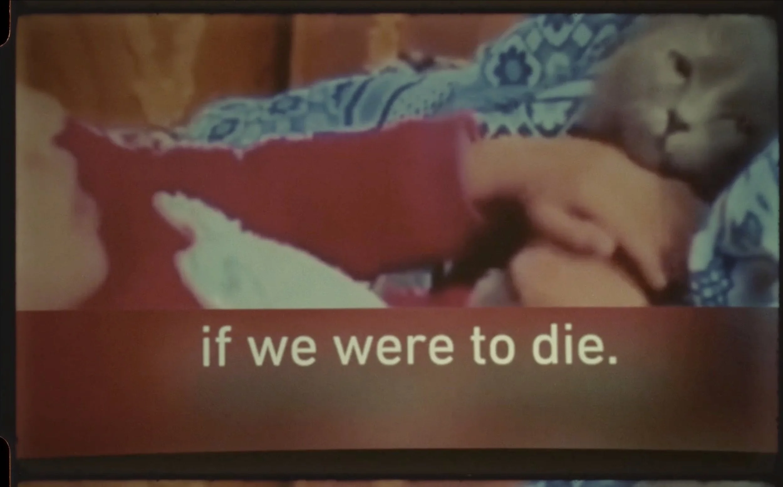 Selander has previously worked with Palestine, and in If We Were to Die she approaches Gaza by re-filming images from social media. Using an older analogue film camera, she lifts them out of the media flow, giving them presence—a body, an index, and a sense of care through the film strip. Here we see a child talking to their cat in a film about closeness, death, and hope.