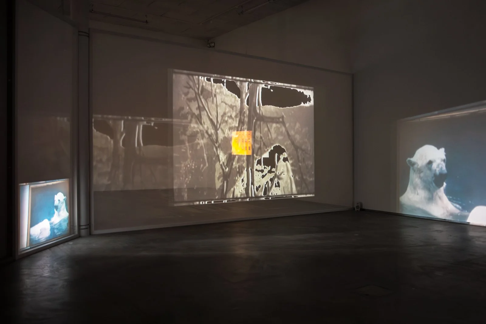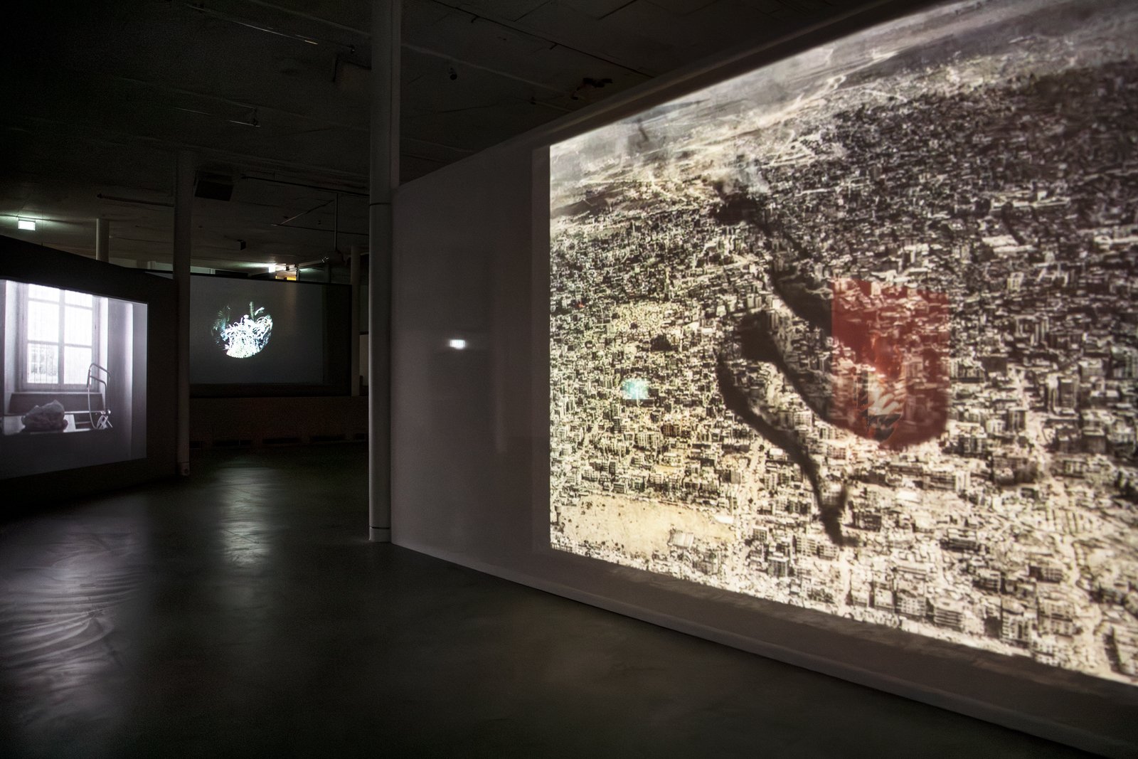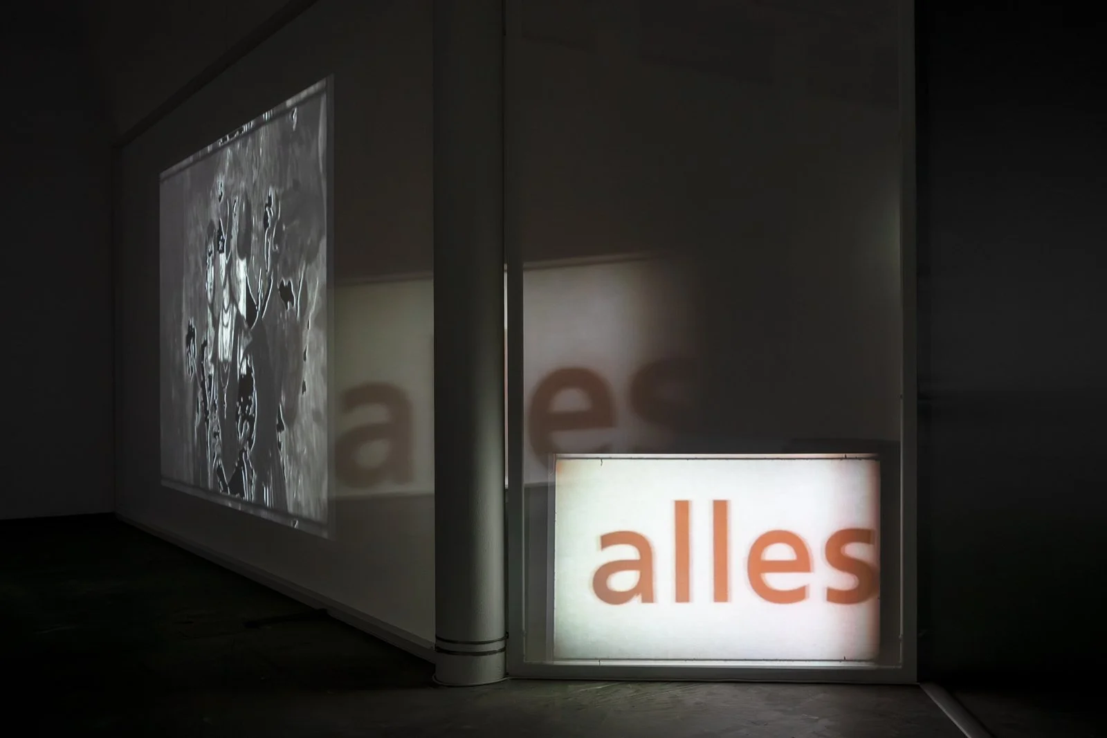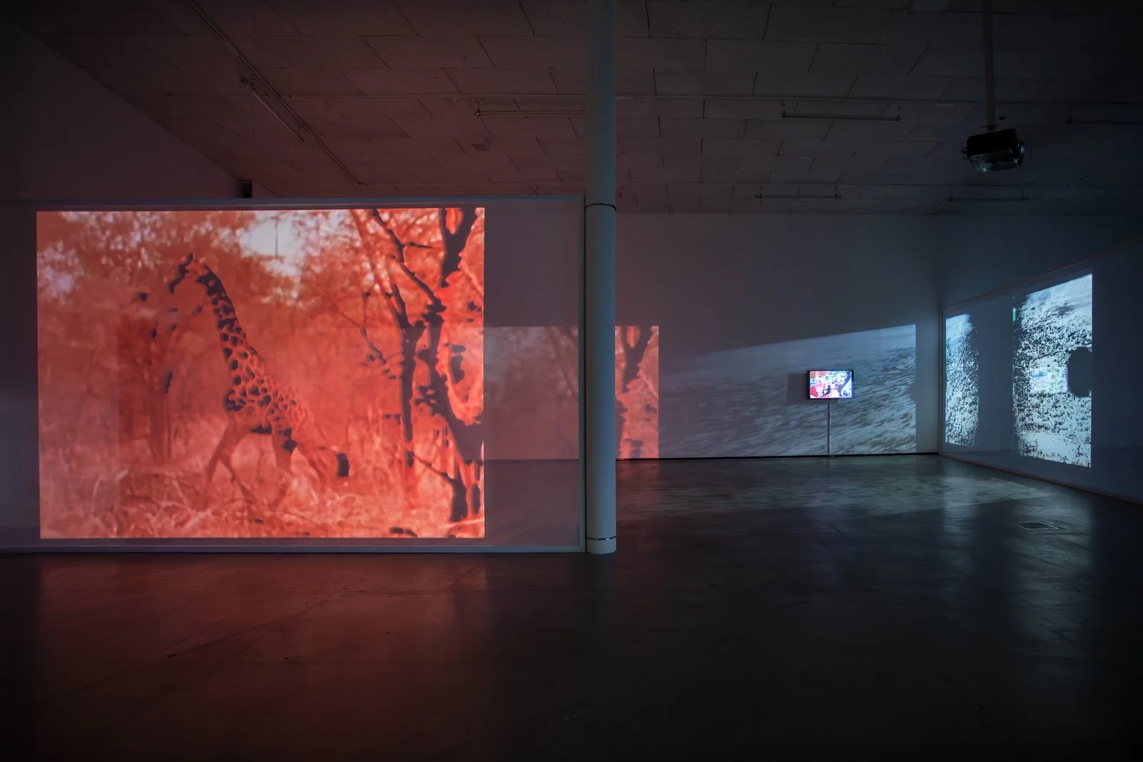 Once down on the gallery floor, we encounter an installation where different film works interact as one whole, consisting of twelve films. Some are projected onto the walls or onto screens with varying degrees of transparency, or are shown on flatscreens. To experience the exhibition, one must walk between the films, which affect each other with their images and sounds. The images mix, bleed into each other and onto the walls and floor of the art gallery. The large installation is in constant change—different layers of space and temporality meet us as if in a floating archaeological excavation. In One Is Equal to One, montage is not just an editing method used in the individual work. It knocks down the walls between the rooms of the different works and allows everything to become one.