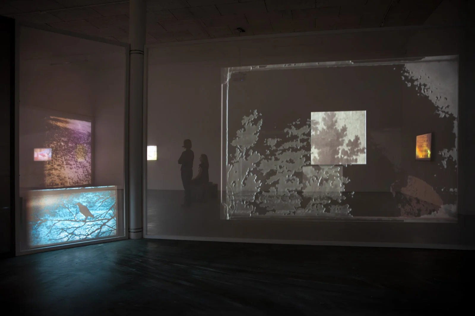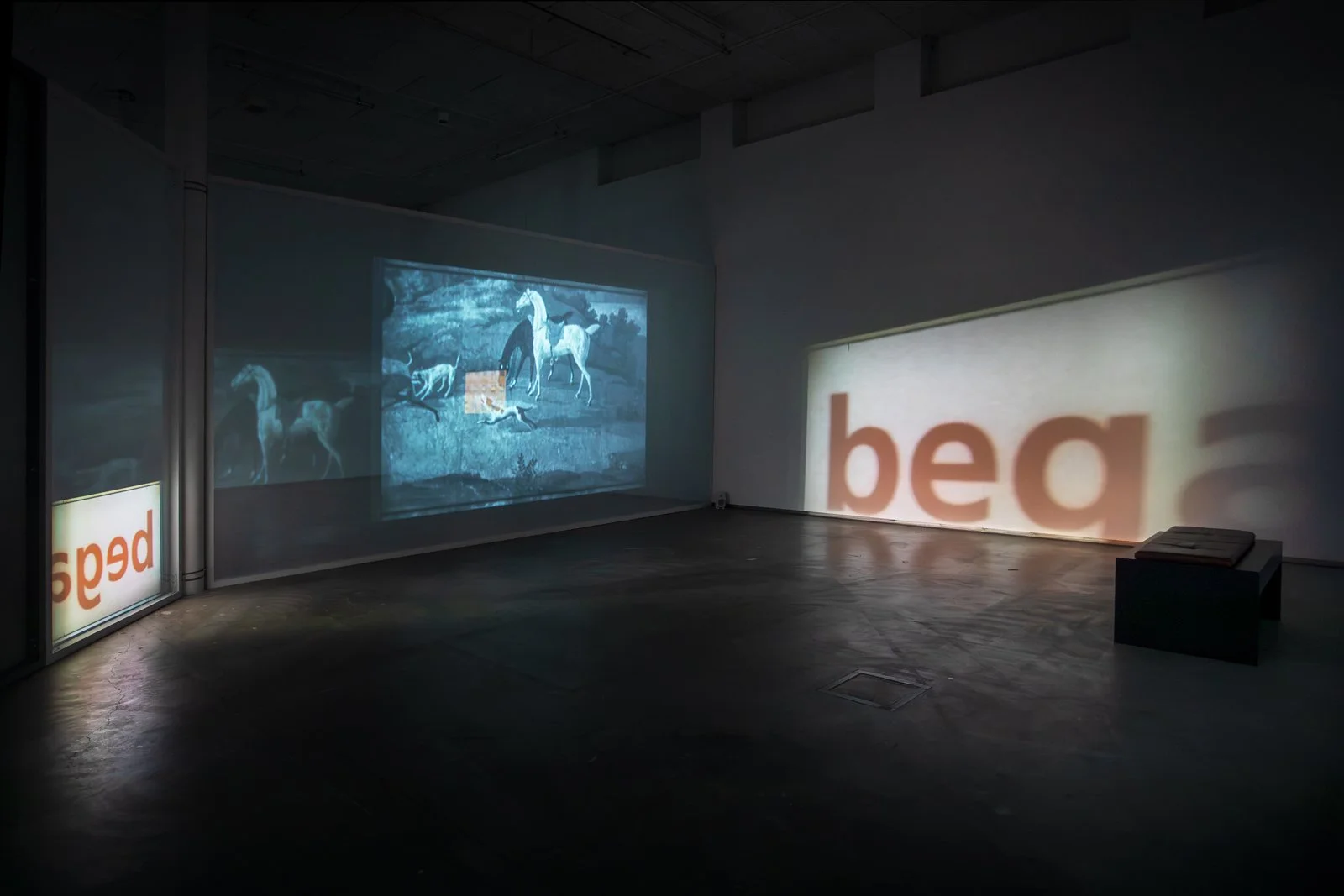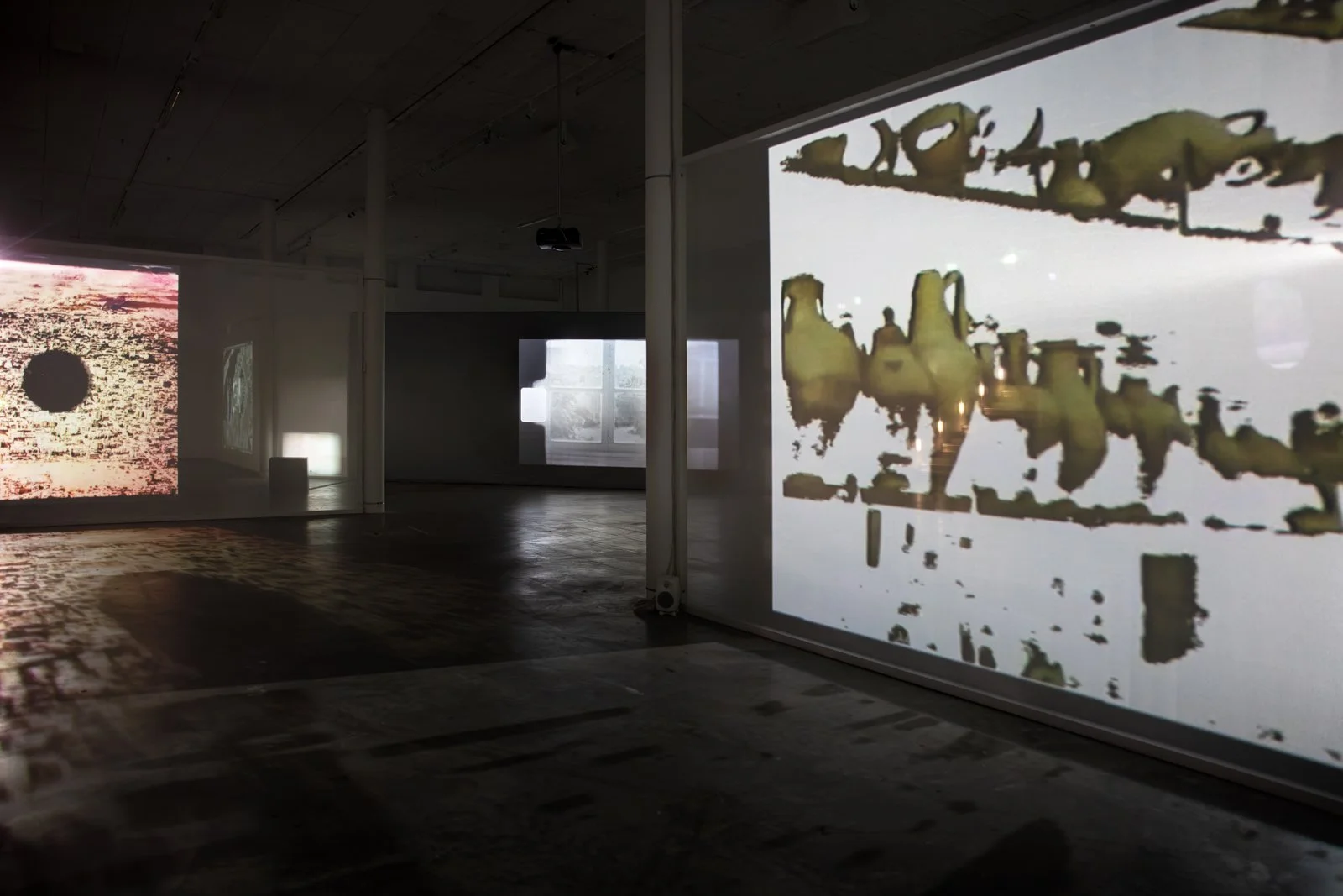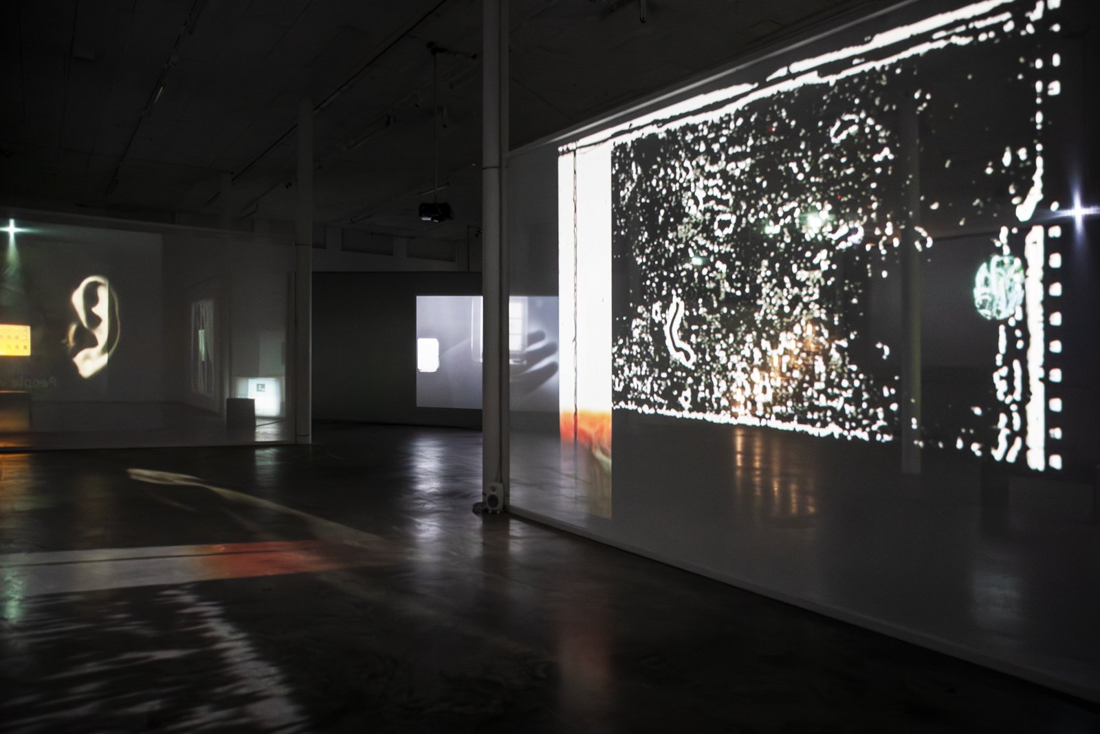 Once down on the gallery floor, we encounter an installation where different film works interact as one whole, consisting of twelve films. Some are projected onto the walls or onto screens with varying degrees of transparency, or are shown on flatscreens. To experience the exhibition, one must walk between the films, which affect each other with their images and sounds. The images mix, bleed into each other and onto the walls and floor of the art gallery. The large installation is in constant change—different layers of space and temporality meet us as if in a floating archaeological excavation. In One Is Equal to One, montage is not just an editing method used in the individual work. It knocks down the walls between the rooms of the different works and allows everything to become one.