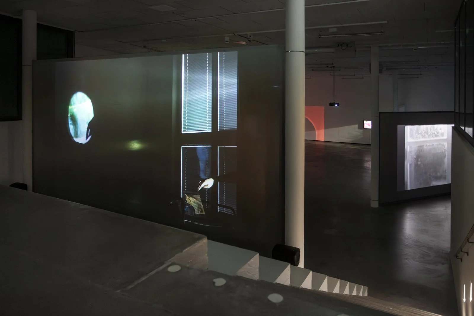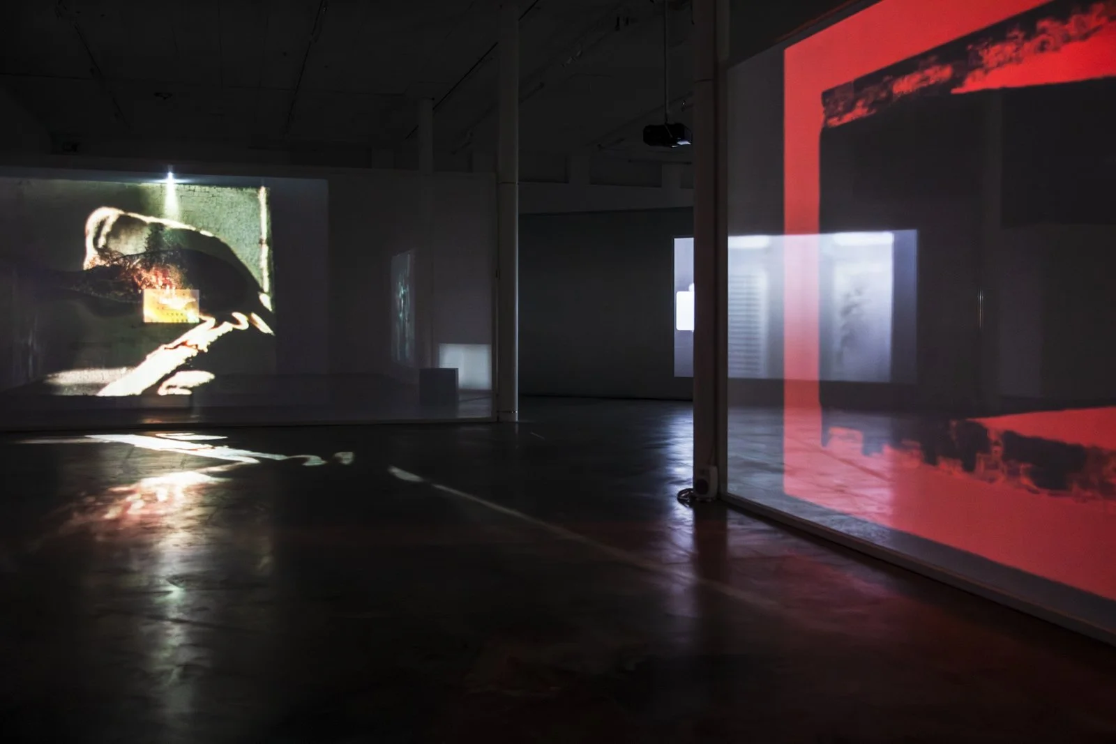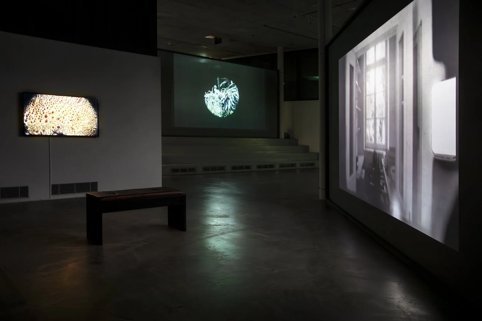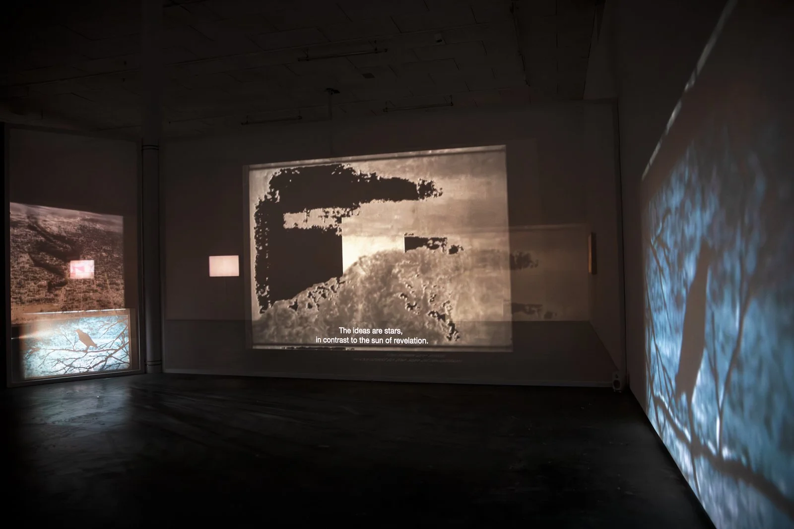 Once down on the gallery floor, we encounter an installation where different film works interact as one whole, consisting of twelve films. Some are projected onto the walls or onto screens with varying degrees of transparency, or are shown on flatscreens. To experience the exhibition, one must walk between the films, which affect each other with their images and sounds. The images mix, bleed into each other and onto the walls and floor of the art gallery. The large installation is in constant change—different layers of space and temporality meet us as if in a floating archaeological excavation. In One Is Equal to One, montage is not just an editing method used in the individual work. It knocks down the walls between the rooms of the different works and allows everything to become one.